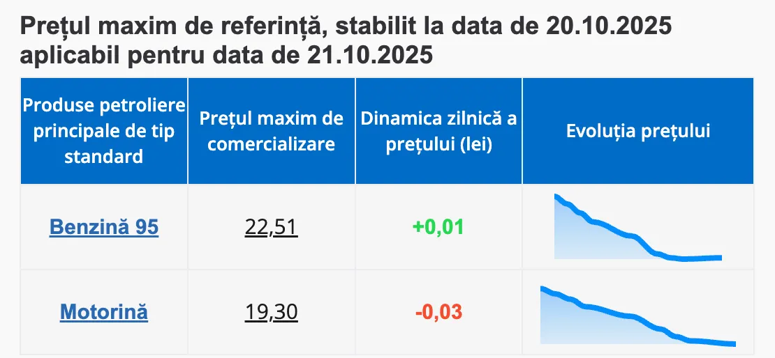 Potrivit noilor tarife, un litru de benzină A95 va costa cel mult 22,51 lei, ceea ce reprezintă o majorare cu un ban, comparativ cu ziua precedentă. În schimb, motorina se ieftinește cu trei bani, iar prețul maxim stabilit este de 19,30 lei per litru.