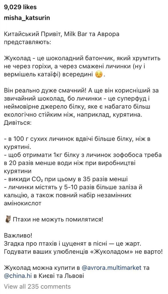 Ciocolata a fost creată în colaborare între două localuri conduse de antreprenorii ucraineni Nikola și Daria Katsurin: restaurantul asiatic „Kitauski Privit” și populara cofetărie Milk Bar.