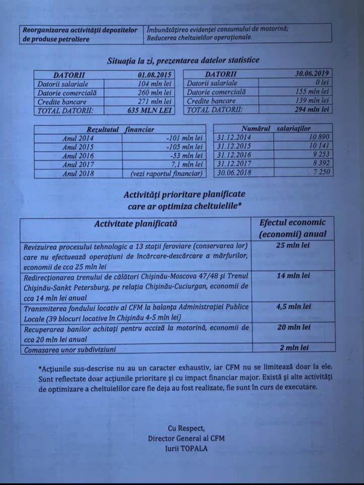 Trebuie să Vă spun că atunci când exercitam funcţia de conducător al CFM, sesizam cu regularitate autorităţile despre orice posibile riscuri care ar periclita buna desfăşurare a activităţii economice a CFM. De multe ori eram criticat, dar acceptam critica pentru că eram conducător, iar un conducător trebuie să-şi asume atât realizările cât şi eşecurile. Indolenţa actualei conduceri a CFM nu se limitează doar la pasarea responsabilităţii pe predecesori, ei merg mai departe şi î-şi arogă realizările mele. Au spus că ei au cumpărat locomotive, deşi contractul de achiziţie l-am încheiat eu după ani de realizare a precondiţiilor finanţatorului, au spus că vor repara capital infrastructura feroviară, deşi nu au cumpărat nici o traversă în aproape 2 ani, pe când eu efectuam lucrări de întreţinere a căii ferate în vederea ridicării restricţiilor de circulaţie şi lista poate continua.
