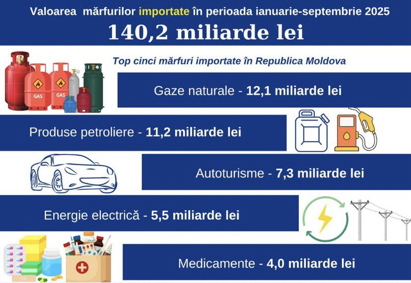 În perioada ianuarie–septembrie 2025, valoarea totală a mărfurilor importate în Republica Moldova a depășit 140 de miliarde de lei, potrivit datelor publicate de Serviciul Vamal.