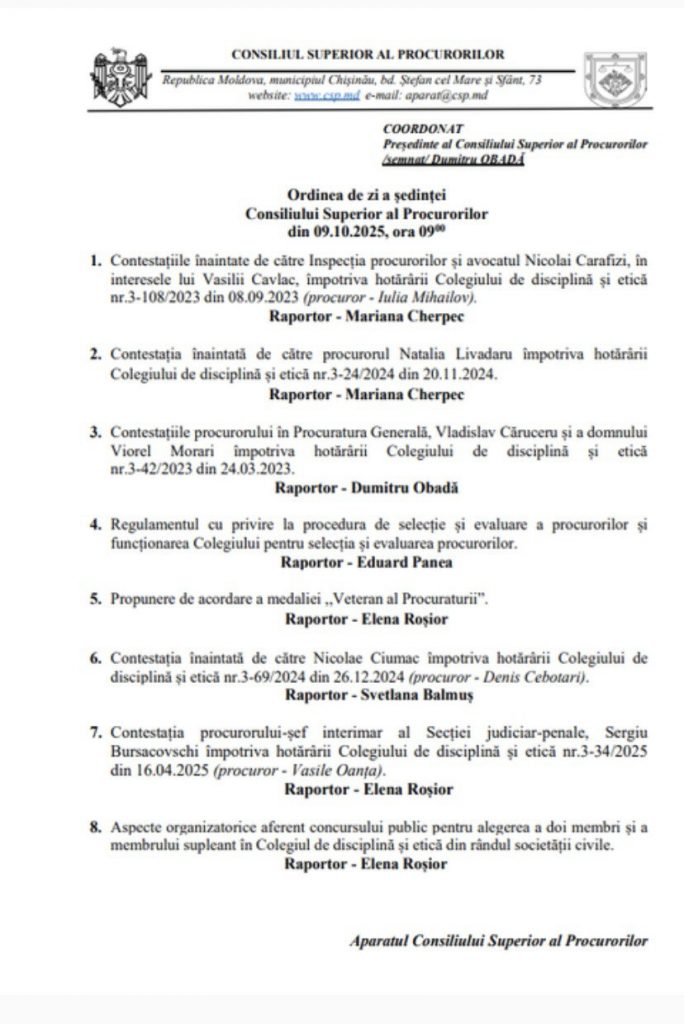 Plenul Consiliului Superior al Procurorilor (CSP) se întrunește astăzi, 9 octombrie, în ședință. Pe ordinea de zi figurează 8 subiecte, cinci dintre care sunt contestații.