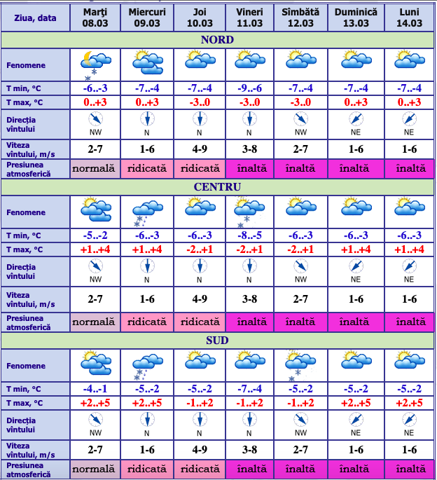 Potrivit prognozei meteorologilor, marți, 8 martie, se așteaptă lapoviță la nordull țării. Astfel, se vor înregistra maxime de până la +5 grade pe timp de zi, iar noaptea vom avea minime de până la -6 grade.