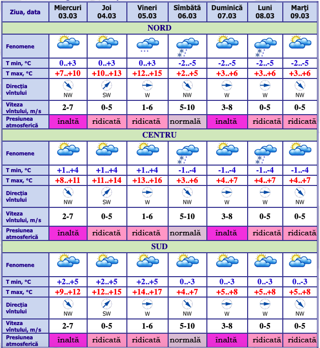 În partea de sud a țării va fi ceva mai cald. Noaptea temperaturile vor ajunge până la +2… +5 grade, iar ziua până la +9… +12 grade.