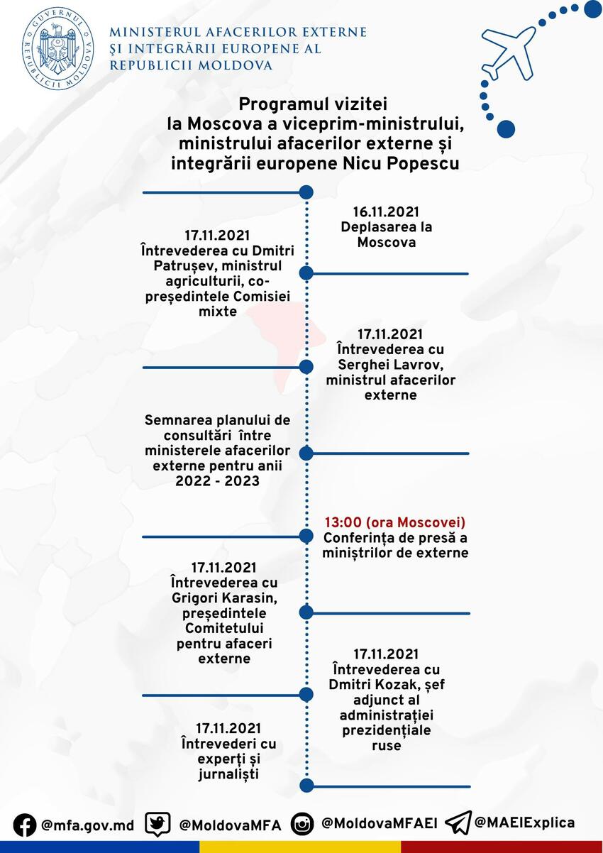 Șeful diplomației Republicii Moldova, Nicu Popescu va efectua, în perioada 16 – 17 noiembrie, o vizită la Moscova, la invitația omologului rus. Acesta va avea întrevederi cu ministrul Afacerilor Externe Serghei Lavrov, cu șef-adjunct al Administrației Președintelui Federației Ruse, Dmitri Kozak și președintele comitetului pentru afaceri internaționale al Consiliului Federației, Grigori Karasin.