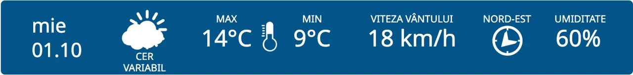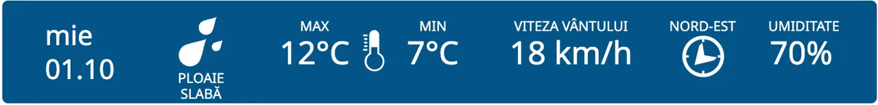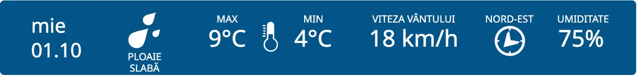 Prima zi din octombrie va fi ploioasă. La nordul și centrul republicii se așteaptă ploi slabe, iar la sud va fi cer variabil. Maximele termice vor fi cuprinse între +9 și +14 grade Celsius. Potrivit Serviciului Hidrometeorologic de Stat, vântul va sufla din nord-est și va avea o viteză de 18 km/h. Umiditatea aerului va fi de 60-75%.