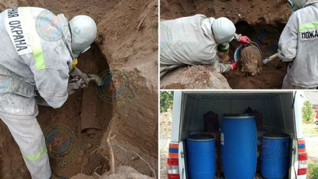 La venire, serviciile specializate au continuat săpăturile și au găsit șase recipiente de sticlă și șase cilindri metalici cu lichid, care au fost trimise spre examinare.