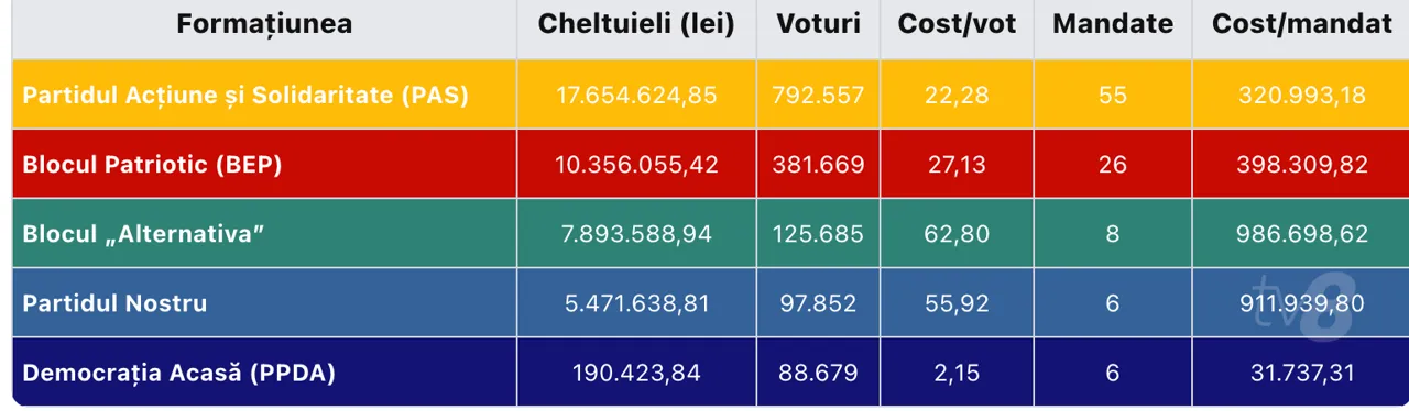 Astfel, analiza arată diferențe majore între modul în care partidele au gestionat resursele financiare, unele reușind un randament mai bun, iar altele plătind scump pentru fiecare loc câștigat în Legislativ.