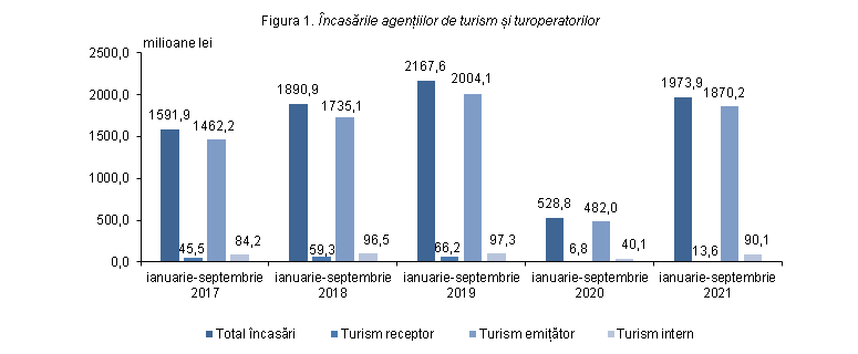 Încasările agențiilor de turism și turoperatorilor din activitatea turistică în ianuarie-septembrie 2021 au însumat 1973,9 milioane de lei, înregistrând o creștere de 3,7 ori față de aceeași perioadă a anului 2020, pe fundalul reducerii indicatorului în cauză în ianuarie-septembrie 2020 față de perioada respectivă a anului 2019 cu 1638,8 milioane de lei sau de 4,1 ori.