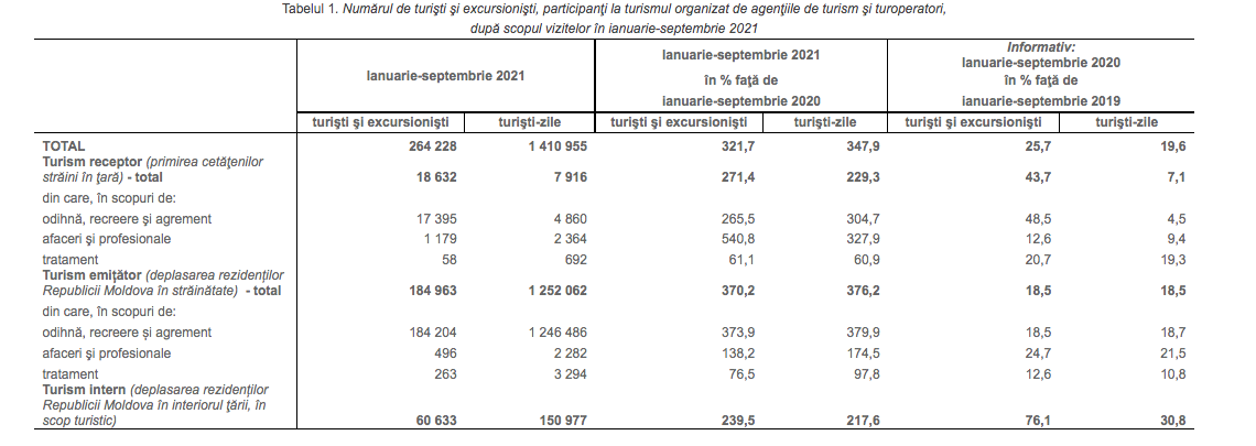 Prin intermediul agenţiilor de turism şi al turoperatorilor în ianuarie-septembrie 2021 au plecat în străinătate 185,0 mii de turişti şi excursionişti sau cu 135.000 de persoane (de 3,7 ori) mai mult față de ianuarie-septembrie 2020, pe fundalul reducerii indicatorului în cauză în ianuarie-septembrie 2020 față de perioada respectivă a anului 2019 cu 220.300 de persoane sau de 5,4 ori.