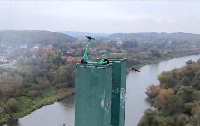 Podul pietonal nu este accesibil pietonilor sau proprietarilor de vehicule cu două roți, așa că rămâne un mister modul în care trotineta a ajuns în vârful turnului.