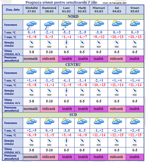 Temperatura maximă a aerului, ziua, pe 27 februarie, va oscila între 5-9 grade de căldură, iar în următoarele zile – între 0 – 6 grade Celsius cu plus.