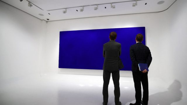 Acest tablou monocromatic albastru, care măsoară aproape doi metri înălţime şi peste patru metri lăţime, pictat în tehnicile obişnuite ale artistului, amestecând pigment pur cu răşină sintetică, este unul dintre cele mai monumentale ale acestui artist, notează AFP, citată de Agerpres.