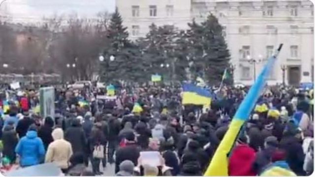 Ucrainenii din mai multe orașe cucerite de forțele ruse au ieșit sâmbătă pe străzi și protestează împotriva ocupanților. Ei s-au urcat pe vehiculele rusești și nu s-au retras nici când militarii ruși au tras focuri de intimidare în aer.