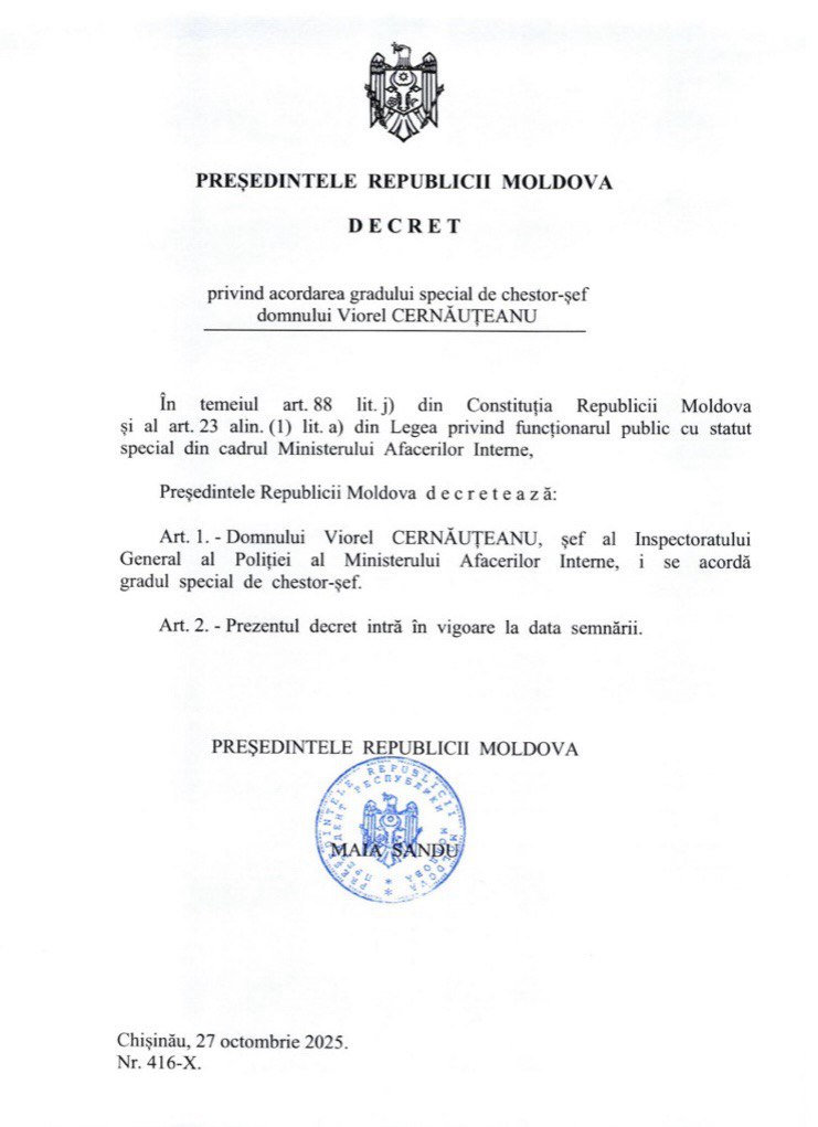 Șeful Inspectoratului General al Poliției (IGP), Viorel Cernăuțeanu, a fost decorat cu gradul special de chestor-șef (general-locotenent). Decretul în acest sens a fost semnat de președintele Republicii Moldova, Maia Sandu, pe 27 octombrie.