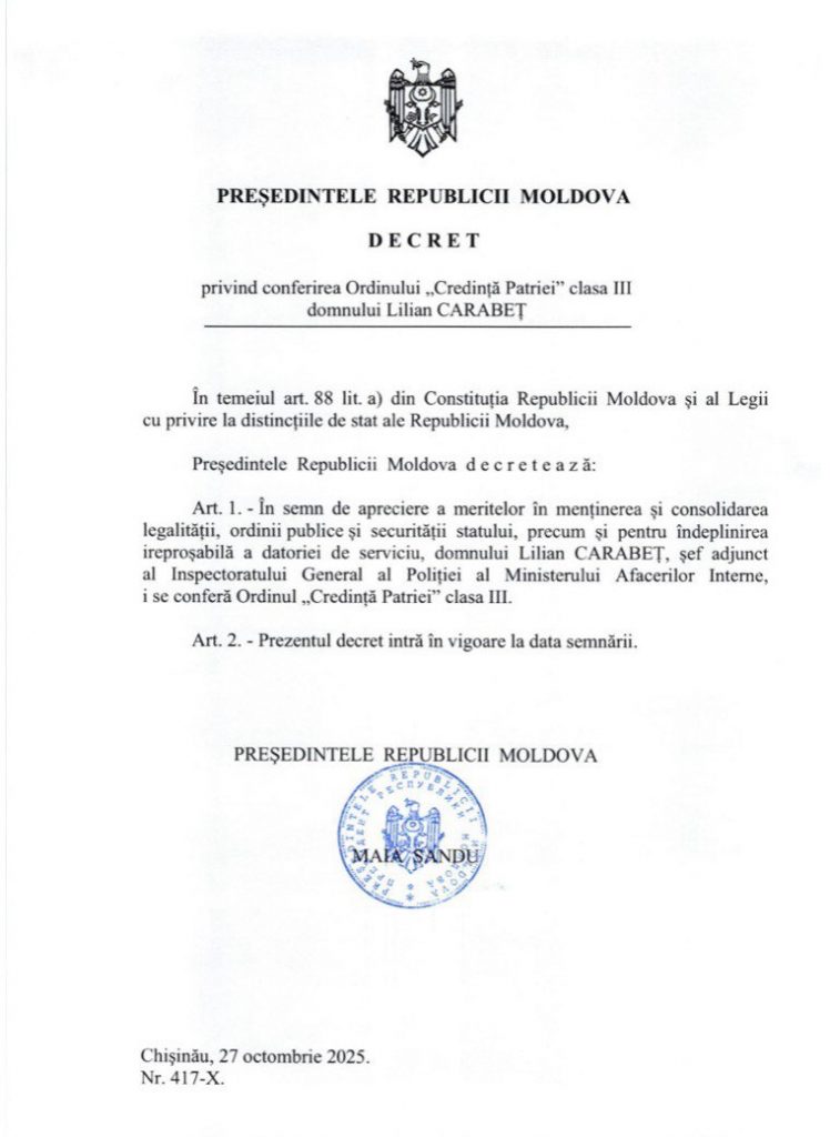 Totodată, președintele a dispus conferirea Ordinului „Credința Patriei”, clasa III, șefului adjunct al IGP, Lilian Carabeț.